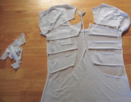 Machen Sie alle 4-5 cm an der Seite des T-Shirts mehrere horizontale Schnitte von unten nach oben, fädeln Sie ein helles Band hinein und binden Sie eine schöne Schleife auf Ihre Schulter - Ihr neues, ziemlich glamouröses Ding ist bereits nicht einmal ein T-Shirt.