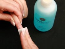 Das Entfernen von Material ist recht einfach und kann auch zu Hause durchgeführt werden. Zu diesem Zweck wird eine spezielle Zusammensetzung auf die Nägel aufgetragen und oben werden die Finger mit einem einfachen Frischhaltefilm umwickelt.Die Wirkung des Arzneimittels dauert 10 Minuten. Während dieser Zeit löst sich der Gelpoliermittel auf und es reicht aus, ihn nur von der Nagelplatte zu entfernen. Die Nägel selbst bleiben in ausgezeichnetem Zustand.