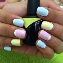 - Danach wird die Nagelplatte mit farbigem Gel bedeckt. Das Verfahren wird in 2 Schichten durchgeführt, von denen jede in einer Lampe eingebrannt wird, damit der Ton ausdrucksvoller wird. Experten empfehlen, jeden Nagel sofort nach dem Beschichten zu trocknen, wie dies häufig in professionellen Schönheitssalons der Fall ist. Zu Hause wird der Prozess dadurch erheblich verlängert.