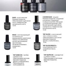 Einige der letzteren sind Champagner und Mirage, die einen angenehmen Glanz haben. Die Gele klassischer Farben haben eine große Auswahl an Farbtönen. Auf diese Weise können Sie originelle und stilvolle Kombinationen in der Maniküre herstellen, was es ungewöhnlich macht. Es wird empfohlen, den Lack in 2 Schichten aufzutragen, damit seine Farben gesättigter aussehen. Luxio Gel bietet seinen Anwendern auch eine Basis und einen Decklack. Durch die Erstellung einer vollständigen Materialliste können Sie Produkte nicht mit anderen Marken kombinieren, was bedeutet, dass die endgültige Qualität der Maniküre auf höchstem Niveau liegt.