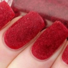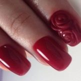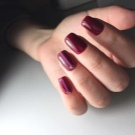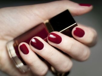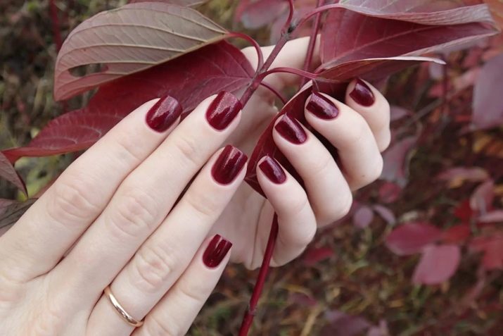 Bei der Herstellung von Maniküre in Burgundertönen muss die Oberfläche der Nagelplatte sorgfältig behandelt werden, um auch kleinere Fehler vollständig zu beseitigen. Das Abdecken eines solchen Tons wird gerade deshalb als schwierig bezeichnet, weil die kleinsten Unebenheiten sofort sichtbar sind. Aus diesem Grund halten es Manikürespezialisten für möglich, nur Gelpolitur zu verwenden. Es beinhaltet sowohl eine hochwertige Oberflächenbehandlung durch Schleifen als auch das Aufbringen einer Nivelliergelbasis. Mit seiner Hilfe können Sie die kleinen Unregelmäßigkeiten der Platte korrigieren.