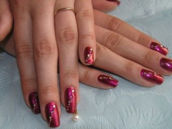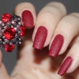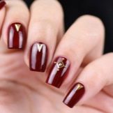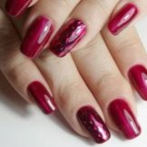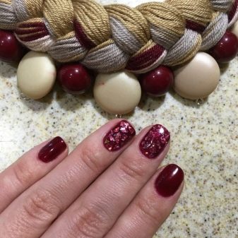 Es gibt eine andere ungewöhnliche Version der Dekoration, die perfekt für die burgunderfarbene Basis ist - dies ist „Glasscherben“. Es sollte aber auch nicht auf allen Nägeln platziert werden, sondern maximal auf drei.