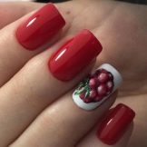 Kirschton eignet sich zum Auftragen von Pailletten und Strasssteinen, kann eine hervorragende Basis für eine Spiegel- oder Glasmalerei-Maniküre sein. Diese Gelpolitur wird mit jedem roten Farbton kombiniert und von Nageldesignern als eine der Komponenten einer abendlichen Ombre-Maniküre empfohlen.