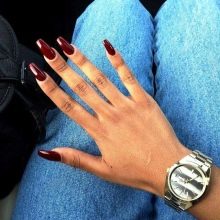 Dies ist eine tiefe Farbe, die sich perfekt in den klassischen Stil von Kleidung und Nägeln einfügt. Auf ovalen Tellern sieht es am rentabelsten aus. Cherry verleiht dieser Form eine besondere Weiblichkeit, Kühnheit und Eleganz. Dieser Farbton wird bei der Herstellung eines Abendbogens bevorzugt. Darüber hinaus sind Altersbeschränkungen praktisch nicht wichtig. Mädchen verwenden Kirsche gerne als verführerischen und verspielten Akzent.