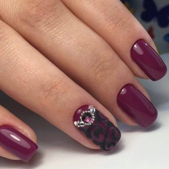 Bei der Erstellung von Kombinationen mit Strasssteinen wird ein unglaublich effektives Ergebnis erzielt. Aber hier ist es wichtig, es nicht zu übertreiben. Verfeinerung und Luxus im Dekor können erreicht werden, indem einige Finger mit einer kleinen Menge Strass verziert werden.