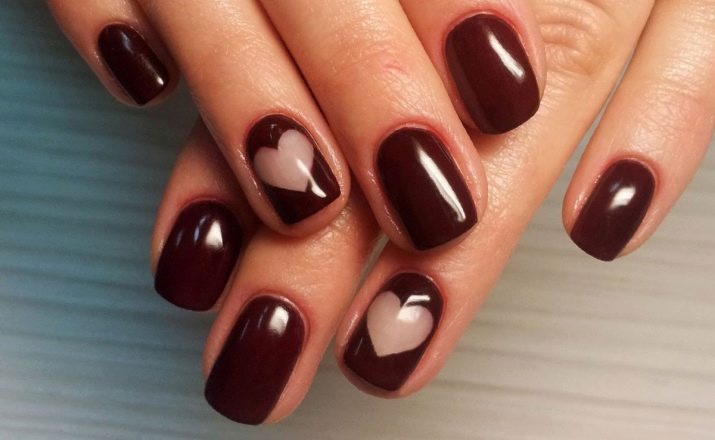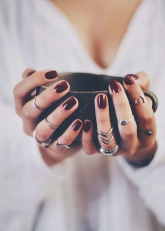Dieser Farbton ist perfekt für Menschen, die energisch, zielgerichtet, geschäftlich und zurückhaltend sind. Wir können sagen, dass Farbe diese Eigenschaften kultiviert. Es wird jedoch nicht empfohlen, sie zu verwenden, wenn Sie ein Bild in großen Mengen erstellen. Es kann den emotionalen Zustand negativ beeinflussen und seinen Besitzer in einem konstanten Ton halten. Aus diesem Grund ist die Maniküre eine gute Option für die Anwendung. Ein kleines burgunderfarbenes Detail an den Händen schafft die notwendige Umgebung, überlastet den Bogen jedoch nicht.
