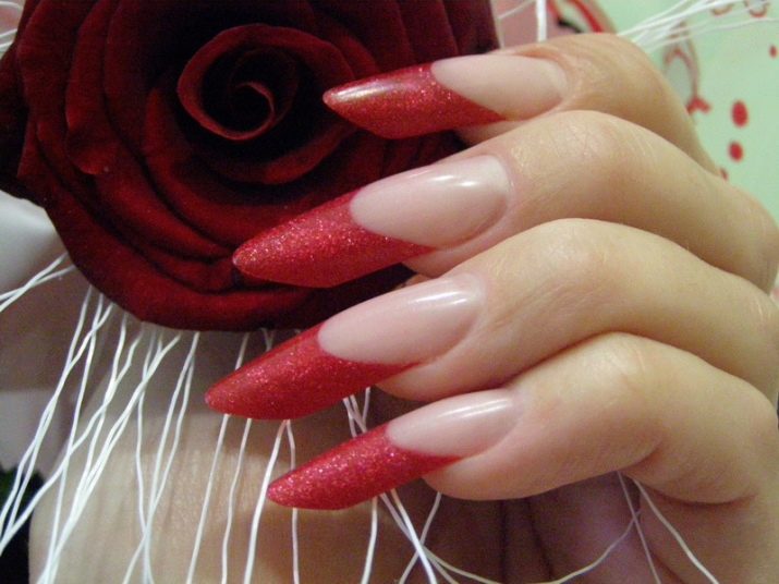Lange, aber nicht scharfe Spitzen in matter Kirschfarbe mit einer kleinen Menge vergoldeter Elemente werden die erfahrensten Fashionistas beeindrucken.