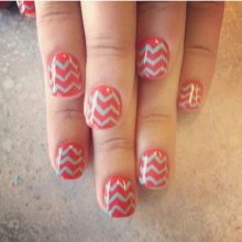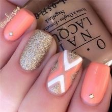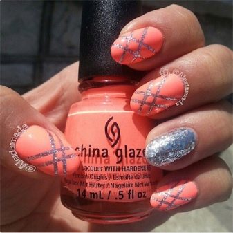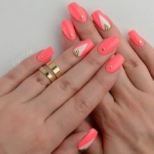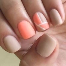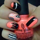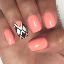 Junge Mädchen lieben oft Geometrie in der Maniküre. Hier ist Koralle wieder im Geschäft. Rechtecke, Quadrate und Rauten, chaotische Linien wählen solide, selbstbewusste Frauen.