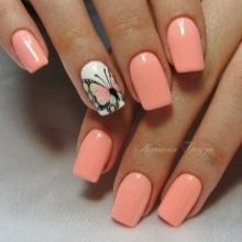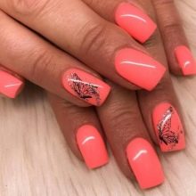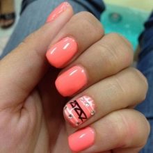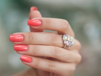 Es wird angenommen, dass Maniküre in Korallenfarbe zur Sommerkategorie gehört, da sie ziemlich hell und eingängig ist.