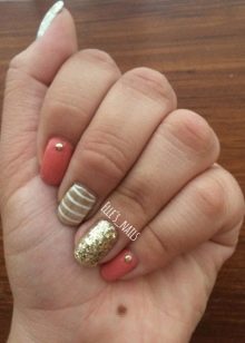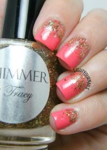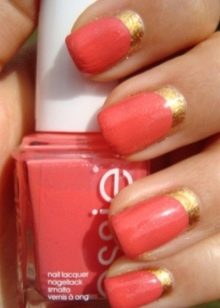 - Goldene Flecken können der Korallenmaniküre Feierlichkeit und Raffinesse verleihen. Sieht gut aus Kombination von Korallen-Purpur.