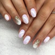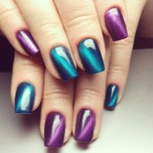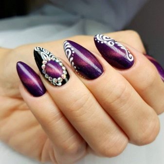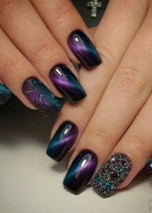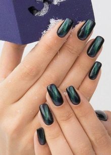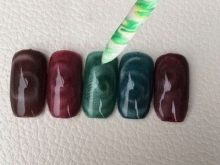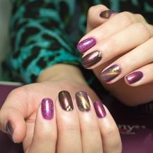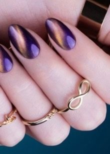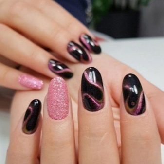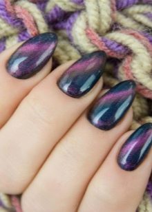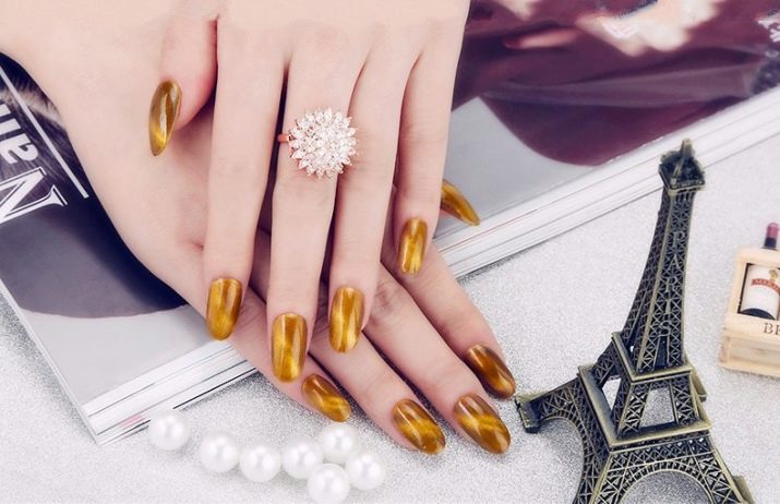 Dieses Gemälde stammt direkt aus der bildenden Kunst und wird nun bereitwillig im Nagelservice verwendet. Um dieses Gemälde verwenden zu können, benötigen Sie Pinsel unterschiedlicher Dicke, Lacke und andere Maniküre-Werkzeuge. Wenn Sie Gelpoliermittel „Katzenauge“ auf einen einfachen Lack auftragen, erhalten Sie ein einzigartiges Muster, das in der Sonne scheint und Aufmerksamkeit erregt. Zusammen mit dieser Technik können Sie Perlen und Strasssteine kombinieren, um das Design der Nägel zu diversifizieren.