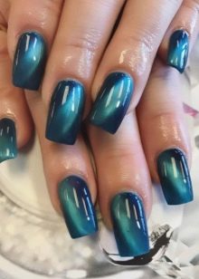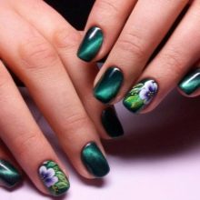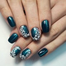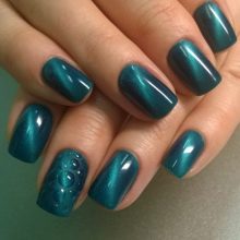 Design mit smaragdblauem Farbton ist perfekt für den Alltag. Eine Maniküre ergänzt jedes Bild und macht die Stifte heller. Solche Farben sind auch perfekt für Mädchen mit blauen oder grünen Augen.