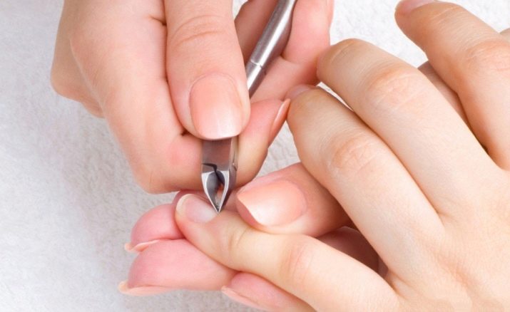 - Es ist notwendig, auf die Hände zu achten: Grate und Nagelhaut. Die oberste Schicht der Platte muss ein wenig geschnitten und leicht geebnet werden, um der Platte die gewünschte Form zu geben. Wenn dies schlecht gemacht wird, liegt der Lack ungleichmäßig. Maniküre wird ruiniert.