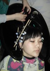 Locken werden auf eine spezielle Haarnadel (nichtmetallisch) gewickelt und dann mit einer chemischen Zusammensetzung verarbeitet. Infolgedessen entsteht eine kleine Welle und die Locken „steigen“ ziemlich hoch.