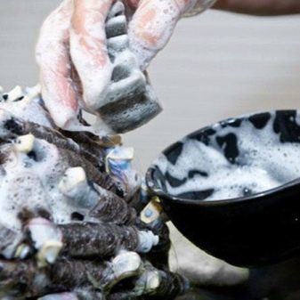 - Schwamm in einer chemischen Lösung getränkt und mit schnellen Bewegungen wird es auf das gekräuselte Haar aufgetragen. Der Nacken wird zuerst bearbeitet, dann die Krone, dann wird der Vorgang seitlich abgeschlossen.