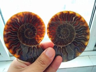 Die Farbe hängt von der Farbe des in der Steinkammer eingeschlossenen Minerals ab. Normalerweise sind die Anführer Blau-, Grün-, Orange- und Gelbtöne, in denen sich Calcit und Chalzedon befinden. Wenn Pyrit in die Kammern "überfüllt" ist, funkelt die Oberfläche des Ammoniten wie Gold. Es wird als Glücksfall angesehen, eine seltene Kombination von Mineralien zu finden: Es gibt Proben, die zur Calcitgruppe gehören. Wenn Ammonit mit Symbirzyten gefüllt ist, kann es mit Bernstein und Karneol verwechselt werden. Das Ding ist das gleiche Pyrit, das dem Mineral eine gelb-rote Farbe verleiht.