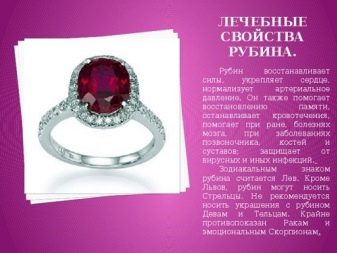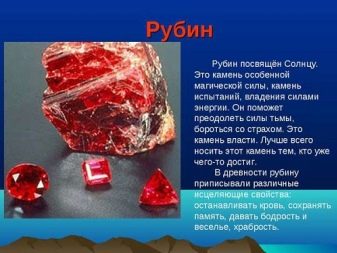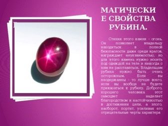 Ruby hilft einem Mann, selbstbewusster und mutiger zu werden, gibt ihm Energie und schützt vor bösen Blicken. Das Juwel macht Frauen attraktiver, zieht Blicke auf sich und zeigt Interesse am anderen Geschlecht.
