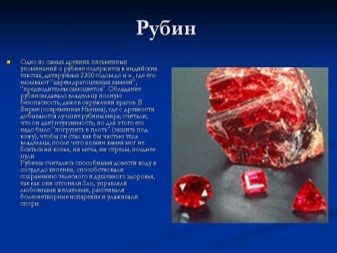 - Klarer Mineralstoff. Rubin wird auf der Basis von Magma gebildet. Selbst ein ungeschnittenes Mineral zeichnet sich durch klare und gleichmäßige Kanten aus, an denen keine Mängel oder Biegungen auftreten. Aufgrund der hohen Dichte können Juweliere die richtigen Schnitte ausführen. Das Juwel ist leicht zu schneiden.