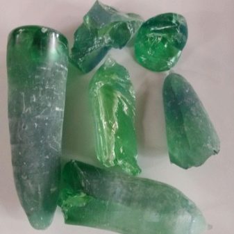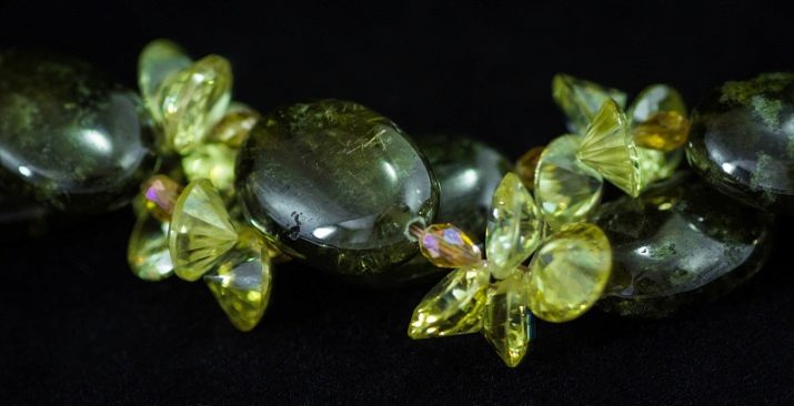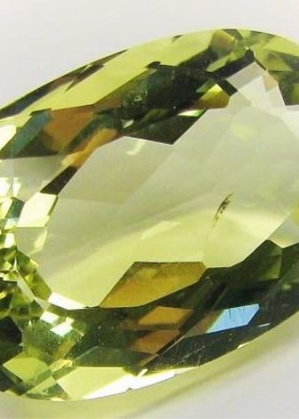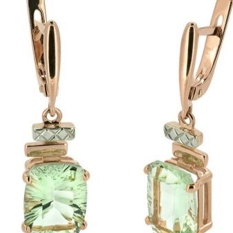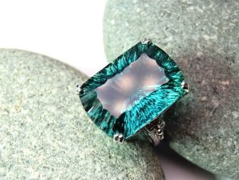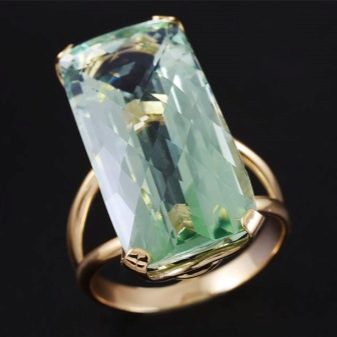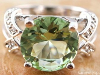 Zwiebelgrüner Prasiolith wird oft als billiger Ersatz für teure Kristalle verwendet und erinnert an das Aussehen von Beryll, Turmalin und Peridot. Naturstein hat eine helle Farbe und ist ziemlich selten. Die Sättigung der Farbe zeigt an, dass das Mineral durch Erhitzen und Bestrahlen von Amethyst erhalten wird.
