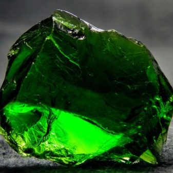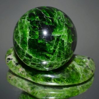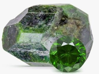Chromdiopside ist ein smaragdfarbener Stein. Dies ist ein sehr zerbrechliches und launisches Mineral in der Verarbeitung, das die seltenste und wertvollste Sorte von Diopsid ist. Nur kleine Kristalle werden geschnitten, größere Steine werden als Zier verwendet.
