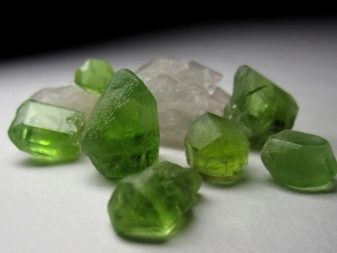 Demantoid, eine Art Andradit aus einer Reihe von Granaten, ähnelt im Aussehen Diamant, nur grün. Verunreinigungen von Chrom und Eisen sind für die Farbe des Minerals verantwortlich, und Titanverbindungen verleihen dem Stein die gelbgrüne Färbung. Das Mineral ist sehr selten, mit einem Lichtspiel in den Facetten übertrifft es sogar einen Diamanten.