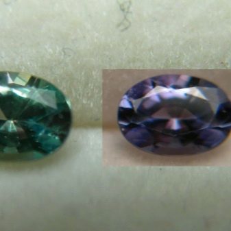 Alexandrit berühmt für doppelte Farbe. Die Farbe des Minerals reicht von dunkelblau-grün bis grün mit einem olivfarbenen Farbton. Diese Farbe ist tagsüber typisch für Stein, und mit Beginn der Dämmerung erhält Alexandrit verschiedene Rotvioletttöne. Dieser Effekt wird aufgrund der Eigenschaften des Kristallgitters erreicht.