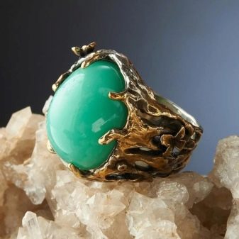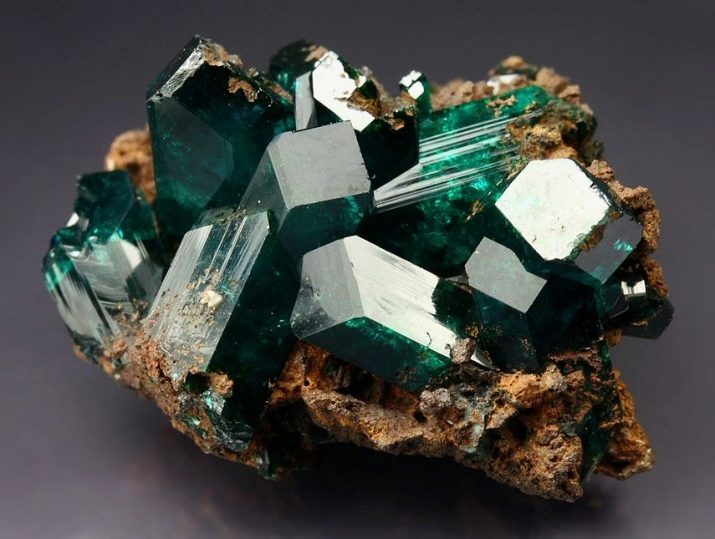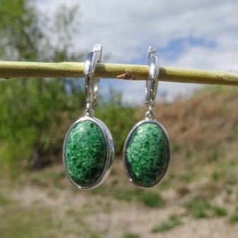 Dioptase ist ein transparentes transparentes grünes Mineral, was ziemlich selten ist. In Schmuck wird es als Einsatz von Rohkristallen für exklusive Produkte verwendet. Es ist schwer zu verarbeiten, da es sehr zerbrechlich ist. Erz mit Dioptasekristallen findet man häufiger in Privatsammlungen und Museen, da sie optisch sehr attraktiv aussehen.