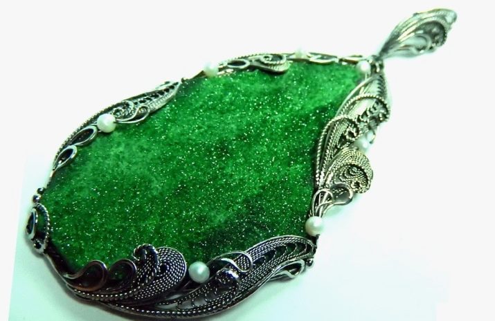 Boil und Grossular sind grüne Granatapfelsorten. Smaragdgrün wird kochen, benannt nach dem Präsidenten der Russischen Akademie der Wissenschaften, Graf S. S. Uvarov, der von Sammlern wegen seiner Schönheit und Seltenheit hoch geschätzt wird. In Schmuck werden Teller mit einem Pinsel aus kleinen Kristallen verwendet. Wegen der Ähnlichkeit der Farbe mit einem Edelstein wird es im Volksmund Ural Smaragd genannt.