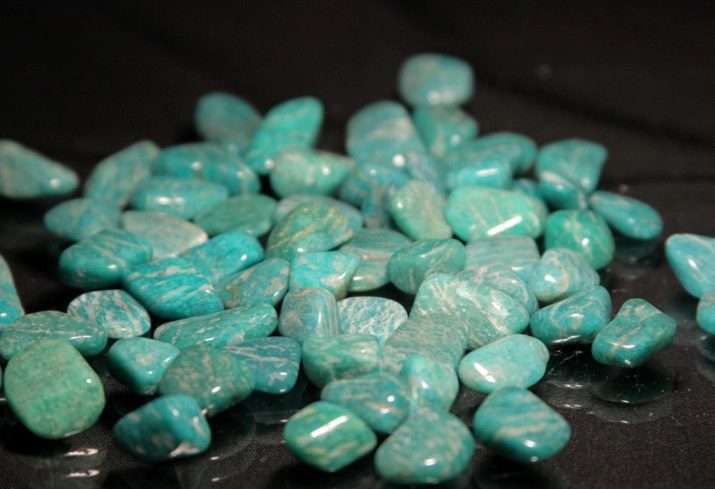 Amazonit - Eine schöne blaugrüne Feldspat-Sorte. Aufgrund der Keimung von Quarzkristallen bildet sich auf dem Schnitt ein eigenartiges Muster, das den Buchstaben entfernter Vorfahren ähnelt. Seltene Amazonitkristalle werden von Sammlern sehr geschätzt, aber im Allgemeinen wird der Stein zur Herstellung verschiedener Handwerke als preiswertes Ziermineral verwendet.