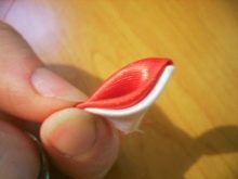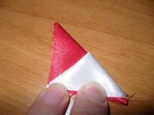 Mehrschichtige Blütenblätter werden hergestellt, indem Quadrate übereinander gelegt und diese 7 Schritte wiederholt werden. Fügen Sie ein neues Dreieck hinzu, um nach den ersten beiden Schritten eine runde Form zu erstellen. Auf der Hypotenuse (lange Seite) finden Sie die Mitte. Sie können eine Linie nach unten ziehen, um die oberen Ecken gleichmäßig nach innen zu biegen. Sie versengen die Basis und schneiden die überschüssigen Teile ab. Drehen Sie das Produkt.