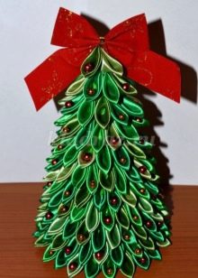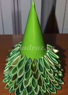 Machen Sie viele doppelt scharfe Blütenblätter. Je mehr von ihnen, desto prächtiger wird der Weihnachtsbaum sein. Sie verbrennen den Stoff, schmieren die untere Reihe des Kegels und kleben die Blütenblätter. In der nächsten Reihe werden die Blütenblätter etwas höher geklebt, so dass sie die Basis der vorherigen bedecken. Die Spitze des Weihnachtsbaumes besteht aus drei zusammengeklebten Blütenblättern. Über den Weihnachtsbaum sind halbe Perlen geklebt. Der untere Teil des Baumes ist mit grünem Rundfilz bedeckt.