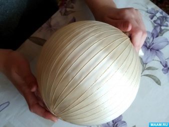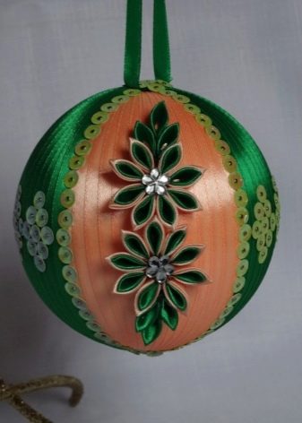 - Volumenkugel aus Brokatband. Ein schillernder Ball im Licht hebt sich vor dem Hintergrund von Glas- und Plastikspielzeug ab. In quadratische Knüppel schneiden, alle Kanten versengen. Die Ecken des Stoffquadrats werden mit Nadeln oder Kleber an der Oberseite der Basis befestigt. Die Quadrate werden zu einem Dreieck gefaltet und über den gesamten Umfang auf das Quadrat geklebt. Jede Reihe wird vergrößert und zur Seite verschoben. Nach der Mitte beginnen sie, die Menge zu verringern. Die Ober- und Unterseite werden mit Klebebandfalten gerollt.