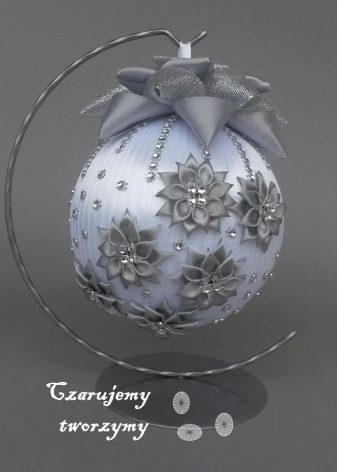 - Einfache Urlaubsfälschung. Der Tischtennisball ist mit einem hellen Band mit Rand umwickelt. Am oberen und unteren Ende des Bandes, überlappend, allmählich miteinander verklebt. Separat werden Blumen im Kanzashi-Stil einer anderen Farbe gesammelt. Kleben Sie den größten Umfang auf. Kleben Sie ein Farbband mit Blumen darauf, um es an einem Ast aufzuhängen. Fügen Sie einen Pinsel nach unten hinzu.