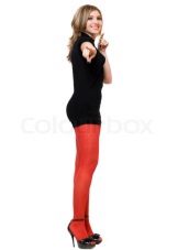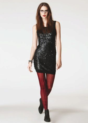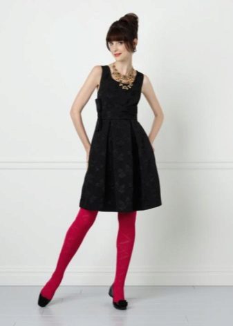 Strumpfhosen in leuchtenden Farben mit schwarzen Schuhen können auch in einem festlichen Kleid sein, aber die Farben, wie der Stil des Kleides, sollten sorgfältig ausgewählt werden, damit Sie nicht wie ein Schulmädchen mit schwarzen Schuhen aussehen.Balancieren Sie in diesem Fall die Unterseite, helle Accessoires, Glanz auf dem Kleid oder sogar hellen Lippenstift passend zu den Strumpfhosen.