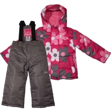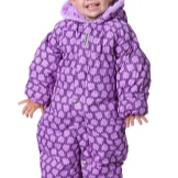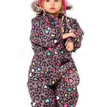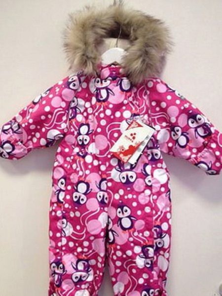 Es ist sofort klar, dass dieses Modell für ein Mädchen ist. Mehrere Rosatöne von hell bis dunkel sorgen für eine erfolgreiche Komposition. Auf diesem rosa Wahnsinn befinden sich auf chaotische Weise Pinguine.Es ist zu sehen, dass der Overall ein durchdachtes System von Verschlüssen in Form eines Reißverschlusses aufweist, der unter einem dichten Stoff versteckt ist. Hände und Füße sind auch vor Frost geschützt. Die kontrastierende Kante der Motorhaube macht dieses Modell noch interessanter.