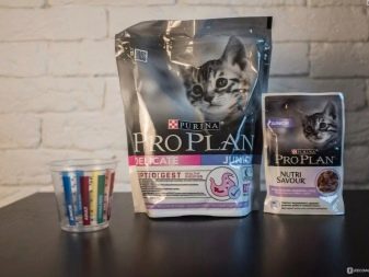 Purina Pro Plan-Feeds sind erschwinglich und weit verbreitet.. Für Kätzchen 1 Version von Trockenfutter und 2 Arten von Nassfutter produzieren.