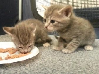 Wie Sie wissen, produzieren Katzen zwei Arten von Futter: trocken und nass. Beide sind essfertig und perfekt ausbalanciert. Ein nasser Look ist die beste Option für die kleinsten Kätzchen, deren Alter 4 Wochen nicht überschreitet. Seine weiche und feuchte Textur wird perfekt von noch nicht starken Milchzähnen gekaut. Darüber hinaus wird das Zahnfleisch aufgrund der Zähne, die in diesem Alter ständig schneiden, gereizt, und die trockene Konsistenz des Lebensmittels kann zu einer noch stärkeren Reizung der empfindlichen Oberfläche des Zahnfleisches und infolgedessen zu einer vollständigen Ablehnung des Lebensmittels führen.
