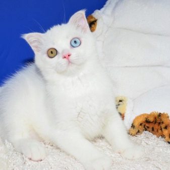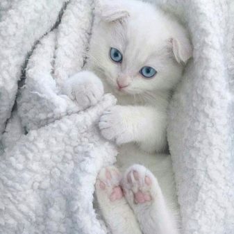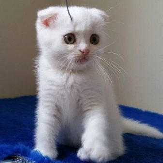 Jeder Züchter hegt den Traum, ein blauäugiges schottisches Kätzchen zu erwerben. Dieses Kätzchen erhält diese Augenfarbe durch Vererbung, und dies kann durch Farbe vorbestimmt werden. Die Farbe des Himmels ist sowohl bei Katzenalbinos als auch bei reinweißen Tartans zu sehen. Solche Schönheiten können in den Vertretern von Scottish Fold gesehen werden. Ihre weiße Farbe inspiriert den Züchter mit Gedanken an Reinheit und Unschuld, Demut und Zerbrechlichkeit.