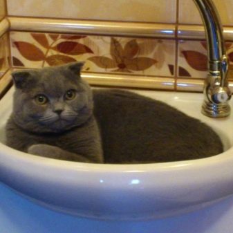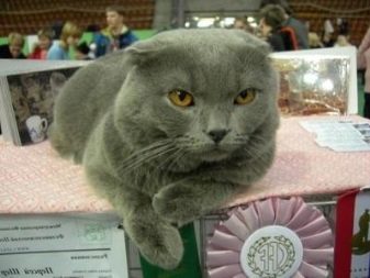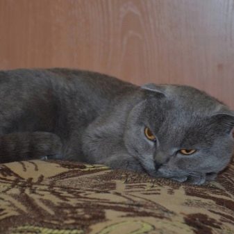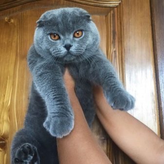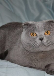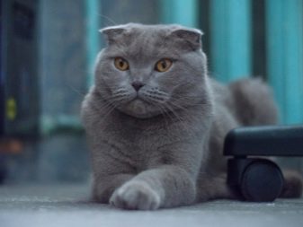 Schottische Falzkatzen mit blauer Farbe werden im Volksmund oft als grau bezeichnet. Und das ist nicht umsonst: Immerhin ist der Schatten ihres Fells mehr hellgrau als blau. Darüber hinaus ist es völlig klar und gleichmäßig. Bei solchen Schotten sind sowohl die Nase als auch die Pfotenpolster dunkelgrau lackiert. Die Augen sind bernsteinfarben oder grün. Außerdem können Sie Katzen mit gelben Augen treffen.