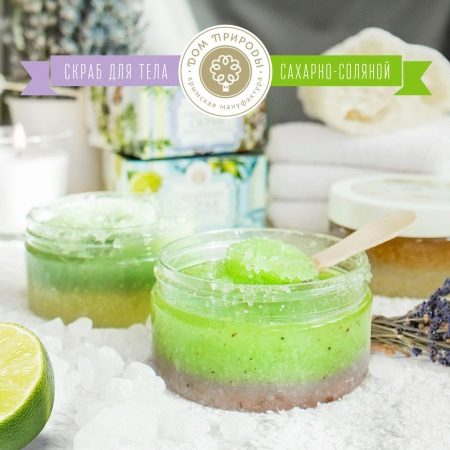 - Für die Körperpflege Das Unternehmen bietet Zucker- und Salzpeelings an. Sie enthalten Salz- und Zuckerkristalle, die in Kombination mit pflanzlichen Fetten die Poren erweitern und Verunreinigungen entfernen.