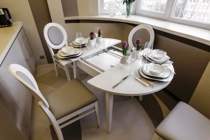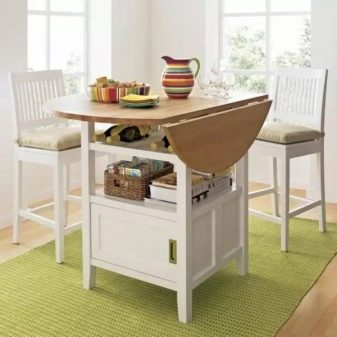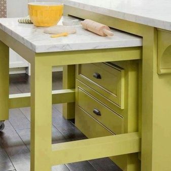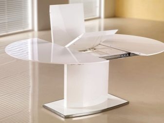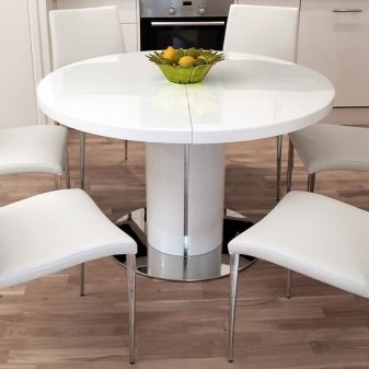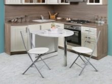 Zusammengeklappt muss eine so bescheidene Arbeitsplatte abwechselnd Lebensmittel aufnehmen. Diese Lösung ist jedoch ideal für schmale Küchen. Im aufgeklappten Zustand werden solche Tische um 30, 40 cm vergrößert oder sogar verdoppelt. Einen besonderen Platz nehmen Modelle mit einer runden Tischplatte mit Klappmechanismus ein. Es ist schwierig, sie mit einem Durchmesser von weniger als 85 oder 90 cm zu treffen, und sie nehmen auf 115 bzw. 120 cm zu. In diesem Fall ändert sich die Form der Tabelle in oval.