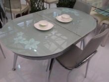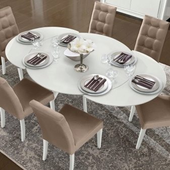 Ähnliche Weichheit und Komfort finden sich in moderneren Richtungen. Dies gilt insbesondere für den Jugendstil. Es gibt nicht viele Dekorationen, Eleganz und Anmut treten in den Vordergrund. Im Gegensatz dazu handelt ein trendiger High-Tech-Act - hier spürt man in allem Schnelligkeit und Klarheit. Mechanismen zum Schieben und Entfalten betonen die technische Komponente. Das Dekor eines solchen Tisches wird zurückhaltend sein, am besten wird sein Charakter die Brillanz von Metall und Glas betonen. Minimalismus ist für die moderne Zeit nicht weniger relevant - hier ist alles prägnant und praktisch. Dies manifestiert sich sowohl in der Farbe als auch in der Textur des Materials.