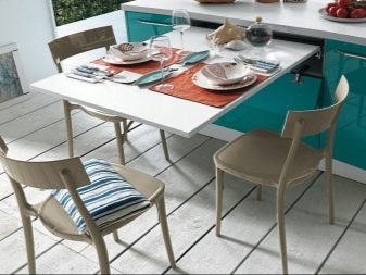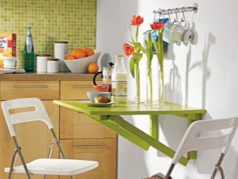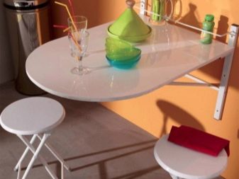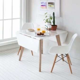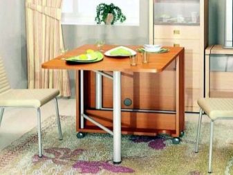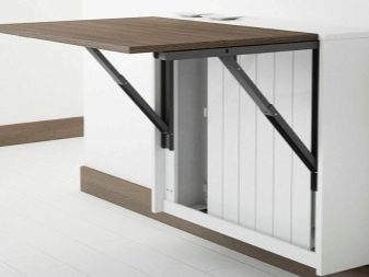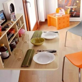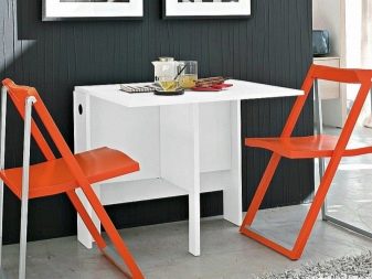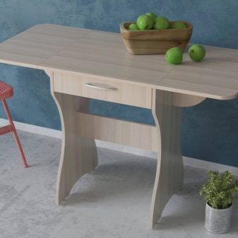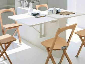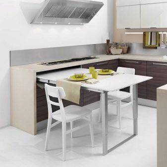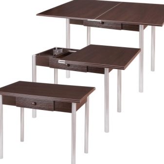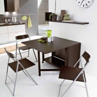 Falten - sind eine Art Falten. Ihr Gerät impliziert das Vorhandensein von ein oder zwei zusätzlichen Arbeitsplatten an der Seite, die leicht angehoben oder abgesenkt werden können. Für eine kleine Küche ist die beste Option ein Tisch, dessen eine Säule eine Wand ist - wenn sie zusammengeklappt ist, ist sie fast unsichtbar. Das gleiche Prinzip wird in bekannten Buchtabellen und deren Modifikationen angewendet.