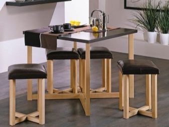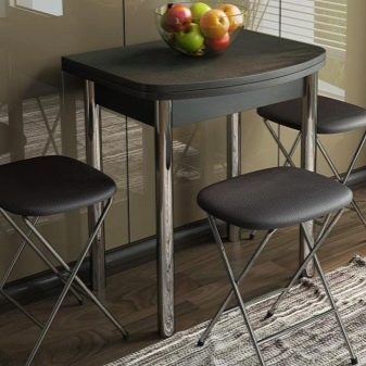 Vergessen Sie nicht die Stühle - sie müssen auch Platz nehmen. In einer kleinen Küche ist es besser, sperrige Stühle oder Sofas aufzugeben. Die optimale Lösung sind kleine Hocker, Klapp- oder Stapelmodelle.