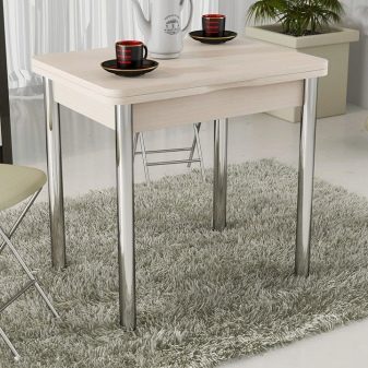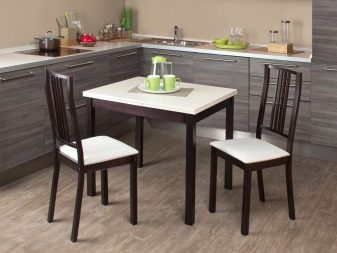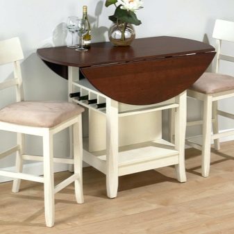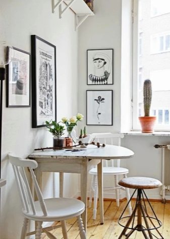 Trotz der Tatsache, dass für eine kleine Küche die Möglichkeit der Vergrößerung mit Kompaktheit kombiniert werden muss, ist die Auswahl in dieser Kategorie sehr vielfältig. Sie können ein Modell "antik" mit glatten Linien, geschnitzten Beinen und einer großen Anzahl von dekorativen Details wählen. Ein Holztisch in der Nähe dieser Option eignet sich für eine Küche, die den Charme eines rustikalen Stils verkörpert.