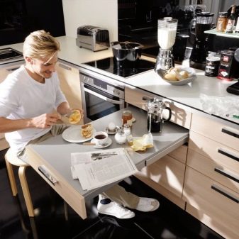 - Anpassungsfähigkeit - Im zusammengeklappten Zustand ist es recht kompakt, aber der Arbeitsbereich der Arbeitsplatte kann bei Bedarf geändert werden. Ein solcher Tisch sollte auch in kleinen Familien sein, da Gäste immer kommen können.