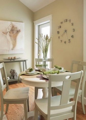 Da es sich um eine kleine Küche handelt, ist es wichtig, diese richtig zu betonen. Trotz der Größe kann der Essbereich zentral gestaltet werden. Wählen Sie dazu Gelb, Oliv, Blau oder Grün - sie sind recht hell, tragen zum Appetit bei und wirken unauffällig. Darüber hinaus versuchen sie, den Rest der Möbel neutral zu machen, um die Grenzen des Raumes optisch zu erweitern. Die gleiche Technik kann auf den Essbereich übertragen werden. Um nicht auf den voluminösesten Teil des Tisches aufmerksam zu machen - das Cover - wird es häufig in weißer oder beiger Farbe bestellt.
