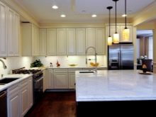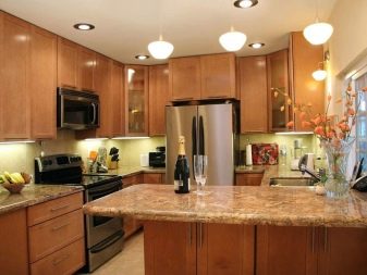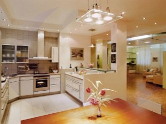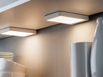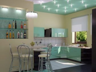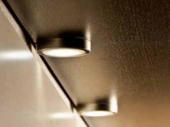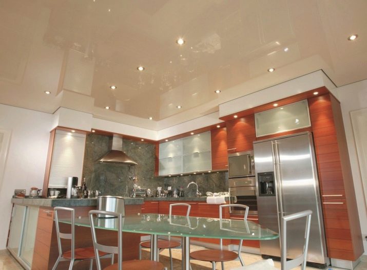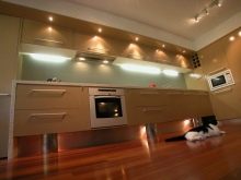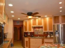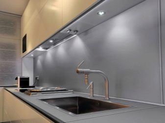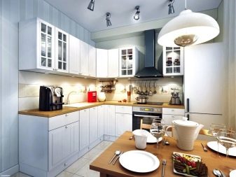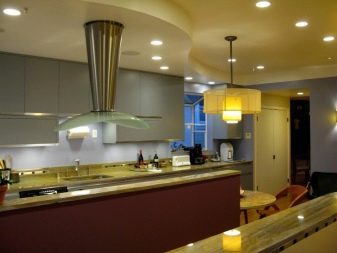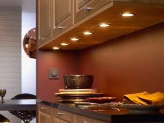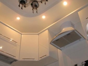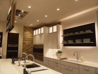 Gegenwärtig ziehen es Verbraucher, die Reparaturen in der Küche durchführen, zunehmend vor, auf den üblichen Kronleuchter zu verzichten oder zusätzlich Scheinwerfer zu installieren. Ihr Hauptvorteil ist die Fähigkeit, eine gleichmäßige diffuse Beleuchtung zu erzeugen. Wie für den traditionellen Kronleuchter, Ohne zusätzliche Beleuchtung entstehen Schatten. Dadurch wird der Raum optisch enger.