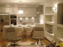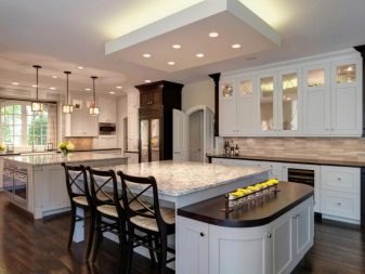Bei großen Räumen besteht die Aufgabe hier darin, die notwendige Beleuchtung vor allem in allen notwendigen Bereichen zu schaffen. Gleichzeitig sollte die Küche im Allgemeinen gemütlich und komfortabel sein. In einer solchen Situation wird am häufigsten auch ein hängender Kronleuchter verwendet. Der Kronleuchter befindet sich normalerweise in der Mitte des Raums, und die Flecken werden in den erforderlichen Arbeitsbereichen installiert.