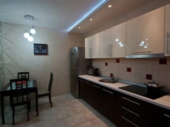 Wenn Sie diese Art der Beleuchtung richtig anordnen, besteht die Möglichkeit, die allgemeine Wahrnehmung des Raums zu ändern. Um beispielsweise eine kleine oder schmale Küche breiter erscheinen zu lassen, können Sie Punkte in der Mitte sowie auf beiden Seiten der Decke platzieren. In diesem Fall wird der Raum gleichmäßig und ohne Schatten beleuchtet.